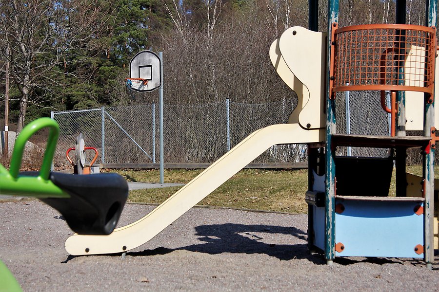 Gungor, pendelgunga, klätterställning, rutschbana, balansgång, korggunga, piruetter, bänkar och bord.