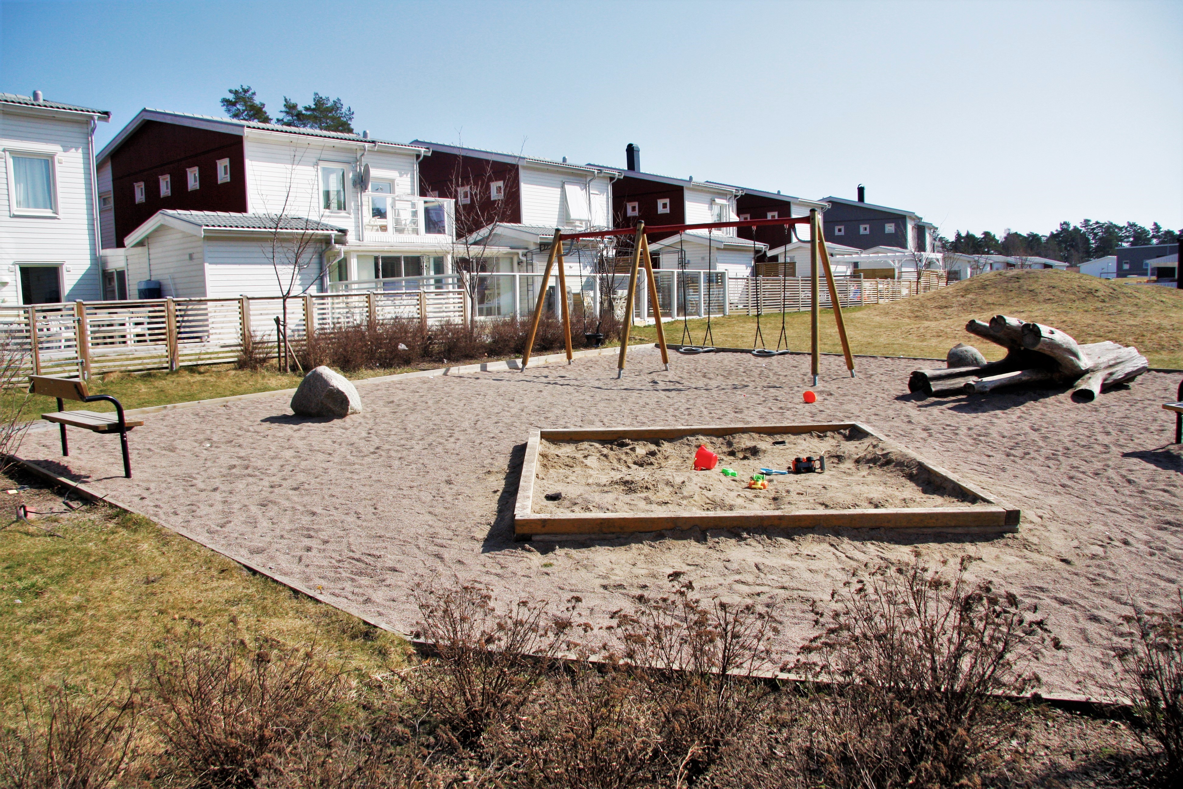 Gungor, sandlåda och bänkar. Trädstam att klättra och leka på.
