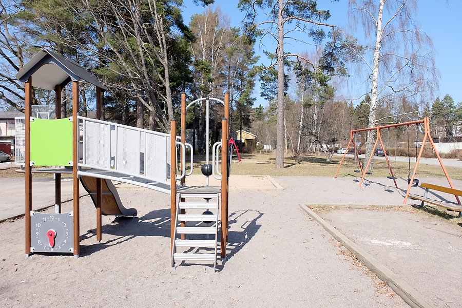 Gungor, sandlåda, pendelgunga, rutschbana, lekhus, korggunga och bänkar.