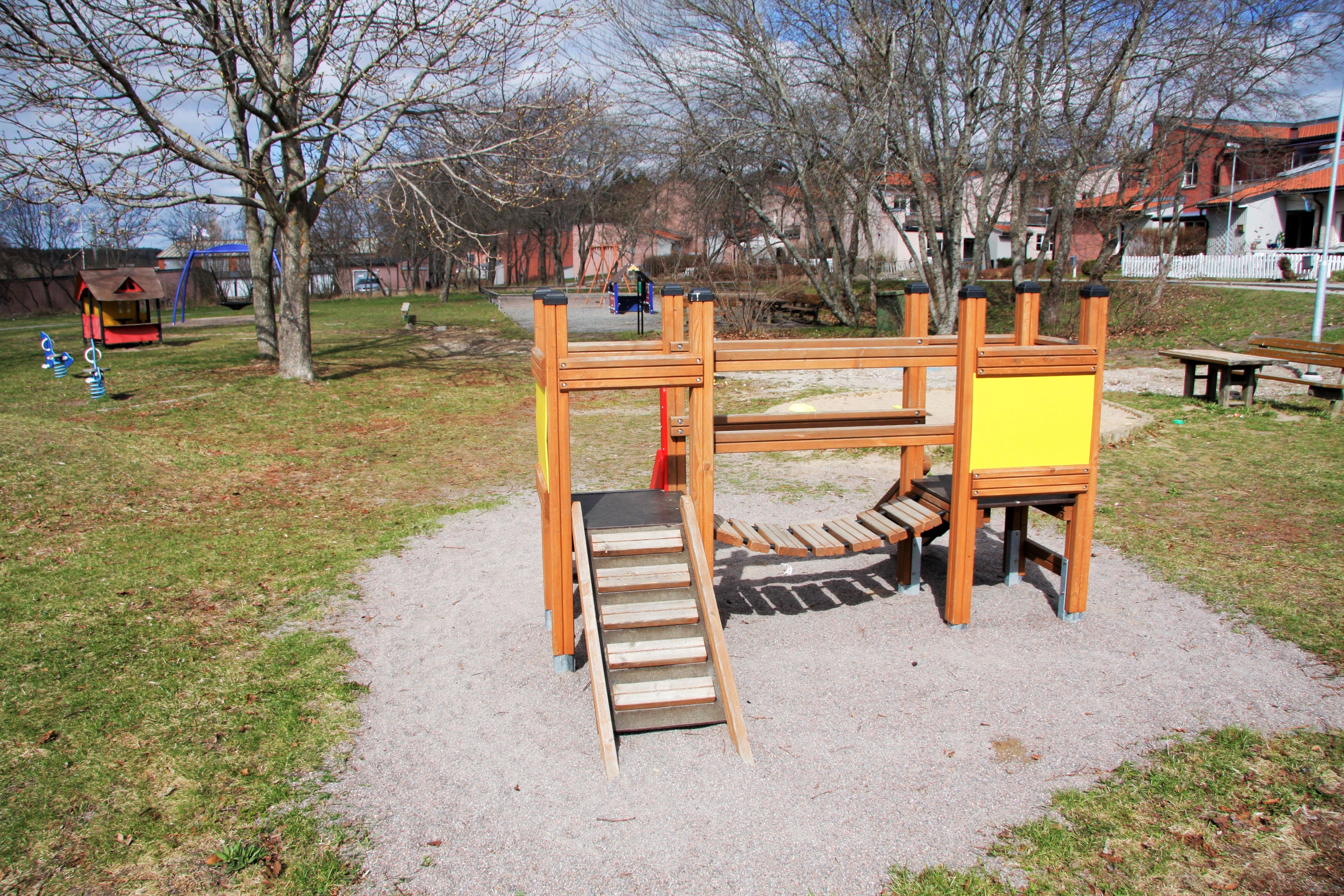 Gungor, sandlåda, pendelgunga, klätterställning, rutschbana, balansgång, lekhus, korggunga, bänkar och bord.