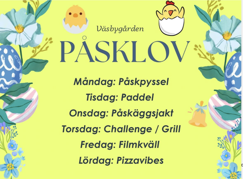 apr 6- apr 11Påsklov på Väsbygården14.00 - 20.00 , Skolvägen 11 -